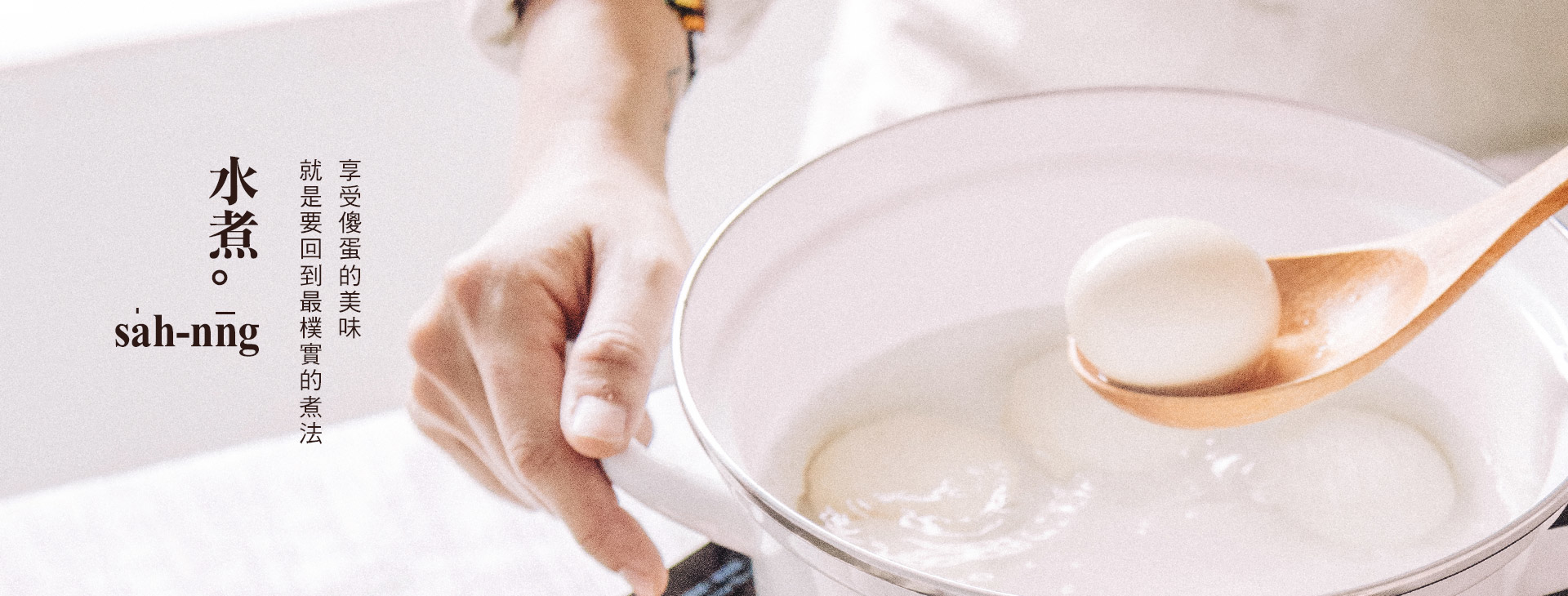 STEP 2. 等待水滾後,再轉成「小火模式」,取勺子開始轉動鍋內雞蛋,讓蛋體均勻受熱。