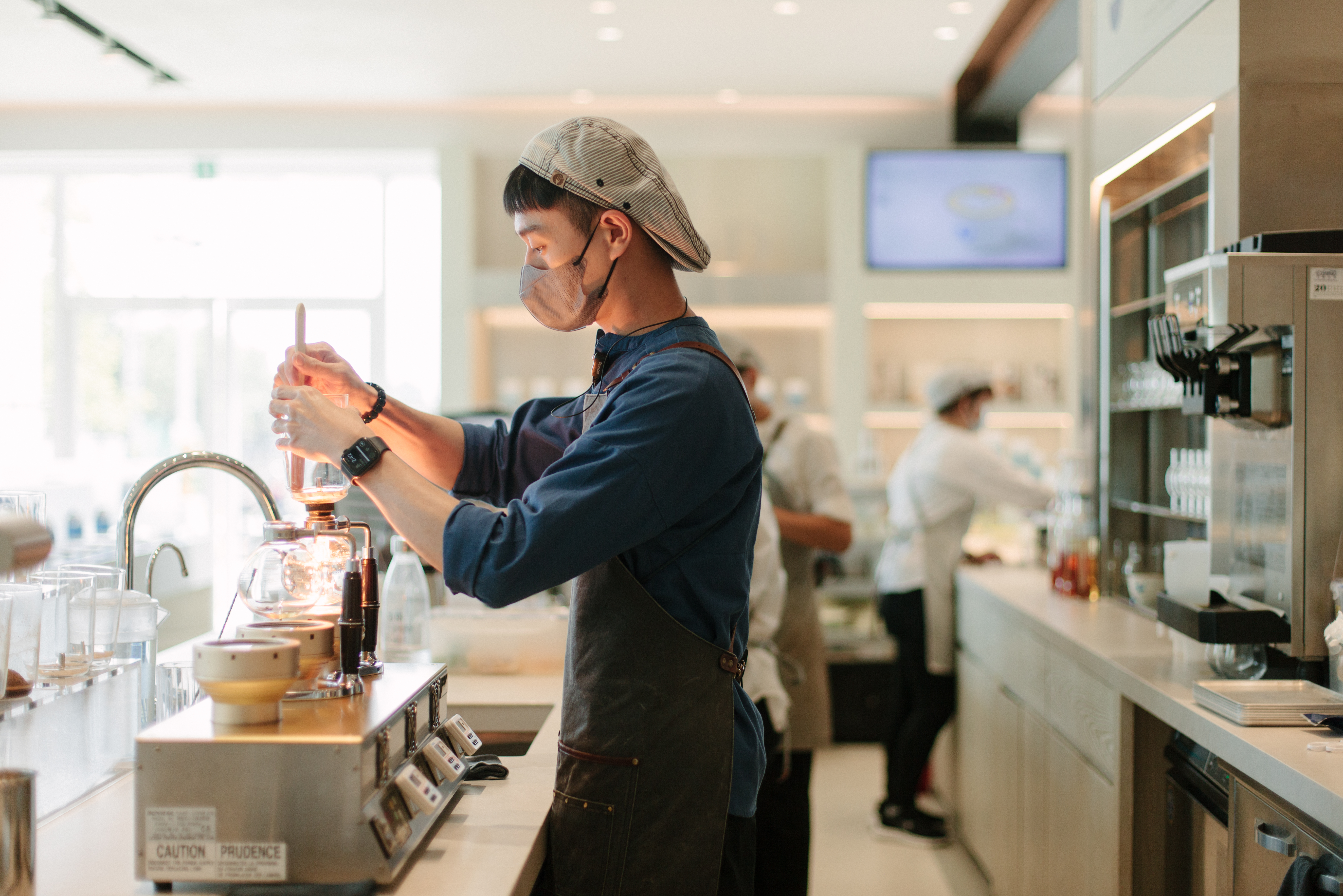在一樓的落地窗位置設計成一排座位,讓人可隨意地伸展四肢,用放鬆愜意的姿勢享受這個片刻。半開放式的空間,呈現出以吧台為中心,就像是一個舞台,看著職人咖啡師專注在沖泡咖啡,客人也成為觀眾的體驗互動下,讓視線聚焦在咖啡製程中。吧台區像是舞台的搖滾區、VIP席,可以近距離的看到咖啡師沖泡咖啡之外;透過落地窗可以看到戶外區那棵來自義大利代表著和平、希望的700歲橄欖樹;往右邊望去,能看到烘豆機將頂級的咖啡豆烘焙出濃厚的香氣。
