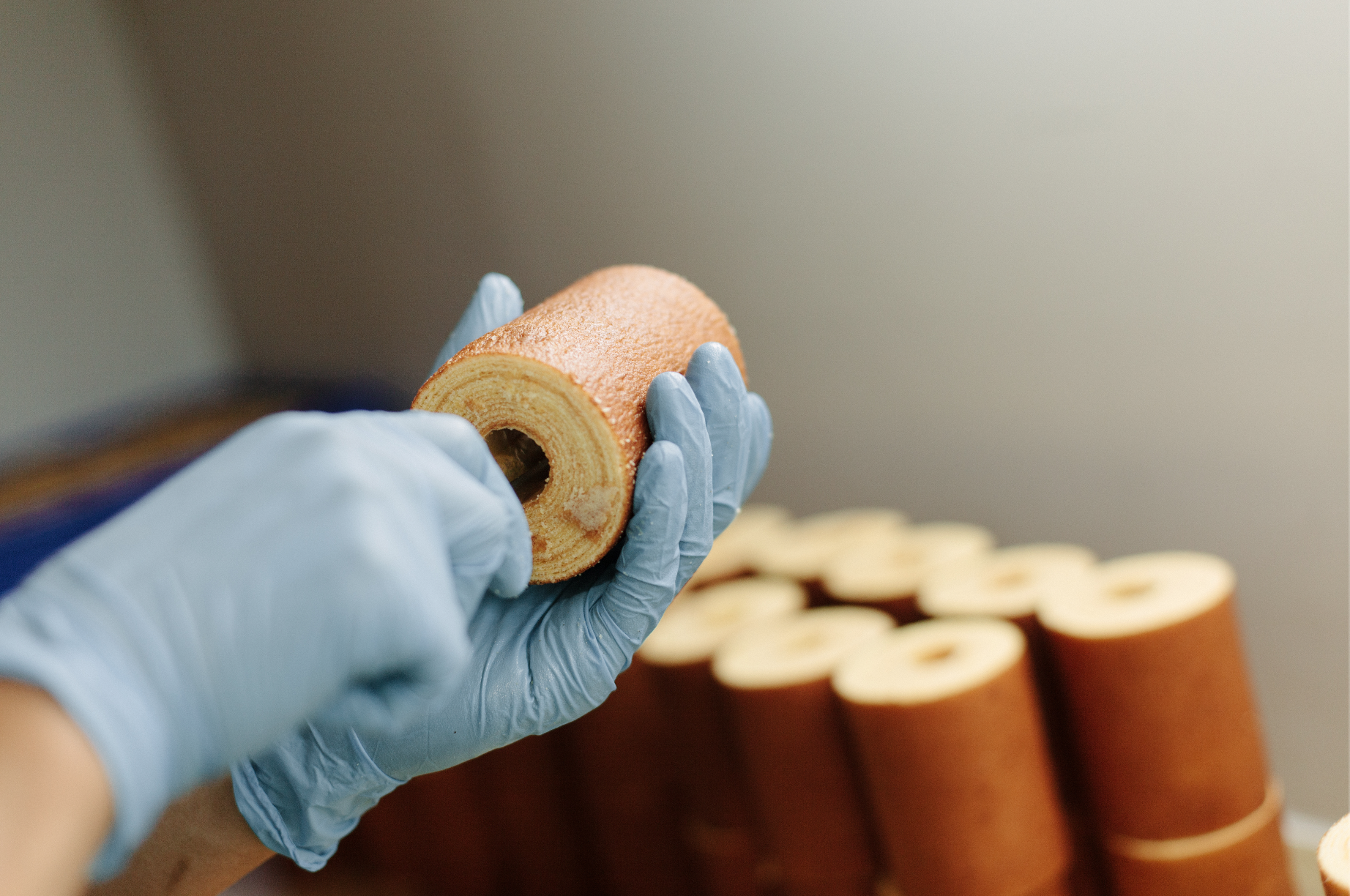吧台區正後方則是採以玻璃隔間的烘焙室,甜點師專注地將 kafeD 甜點的靈魂——年輪蛋糕,反覆滾動捲起,最後烘焙出層層口感的豐富味道。吃得到也看得到的美好滋味,是 kafeD 為了使每一個到來的客人,都能夠體會到的用心。