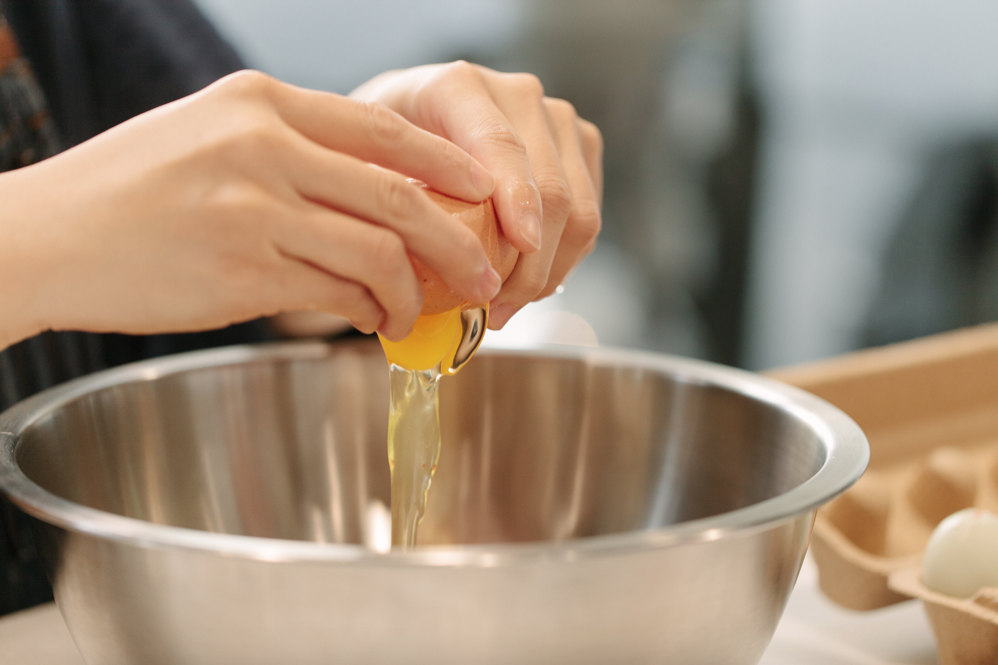 kafeD 甜點師 Cari 分享這次與傻蛋合作的機緣下,有明顯感受到食材的不同。雞蛋,幾乎是甜點的主原料,因此蛋品品質就顯得格外重要,像是蛋糕最常見的「打發」環節,如果是品質好的雞蛋,就能提升打發的效率;蛋糕經過烘烤,水分散失之後,留下來的濕潤、蓬鬆口感就取決於蛋的好壞與新鮮度。