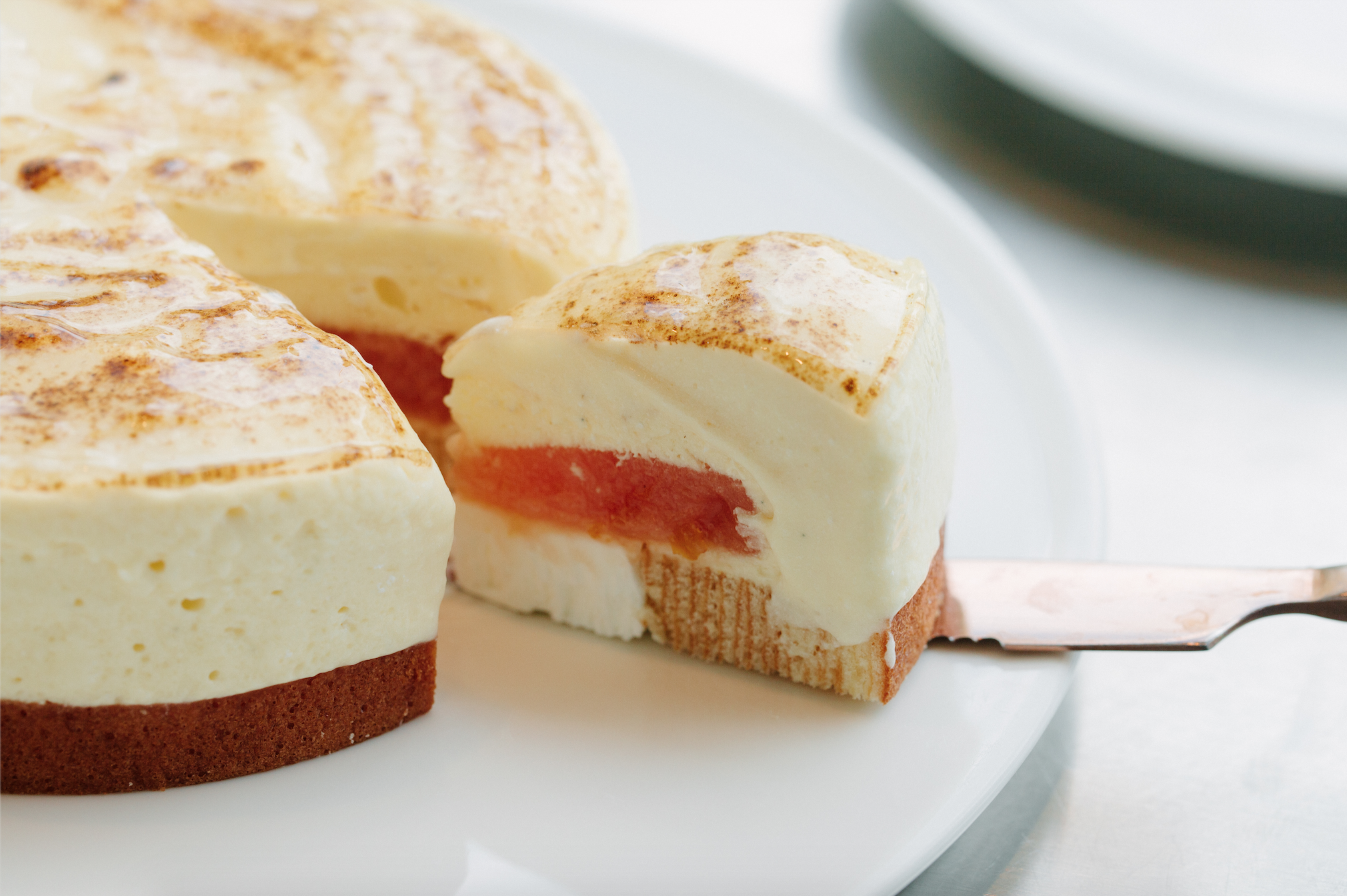 研發此款蛋糕的背後,其實也藏著甜點師對於家人的愛,因父母長年吃素的關係,讓甜點師發想過程中思索到素食者的需求,因此沒有添加吉利丁,讓蛋奶素的人都能享用。也因為少了吉利丁凝固的作用,蛋糕會隨著時間稍稍融化,更能吃到兩種不同狀態和口感的蛋糕。