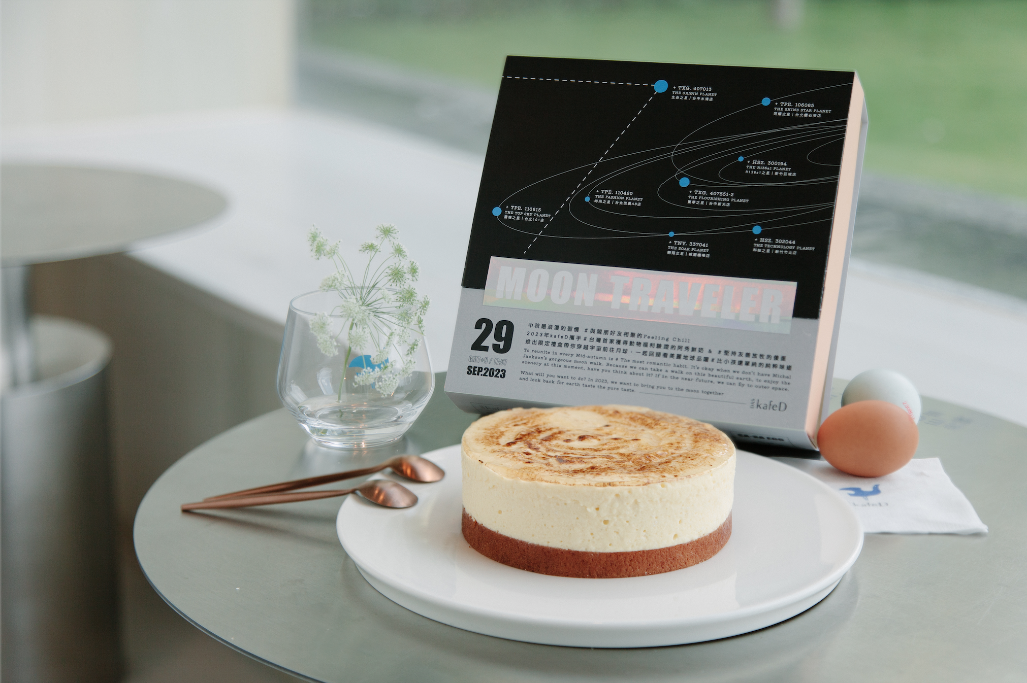 德國人重視家人間的相處時光,就像台灣人每逢中秋時節,會相聚在一起慶祝,是既浪漫又美好的習慣。透過傻蛋及 kafeD 跨界合作,期望大家團聚享用蛋糕時,創造出更多的快樂回憶。甜點師提及之所以選用席布斯特蛋糕(Chiboust)作為中秋蛋糕的原因,是因為表面炙燒過後的會有不規則上色分佈,就像月球表面,不論是抬頭觀月或是低頭品嚐都能有賞月的樂趣在。