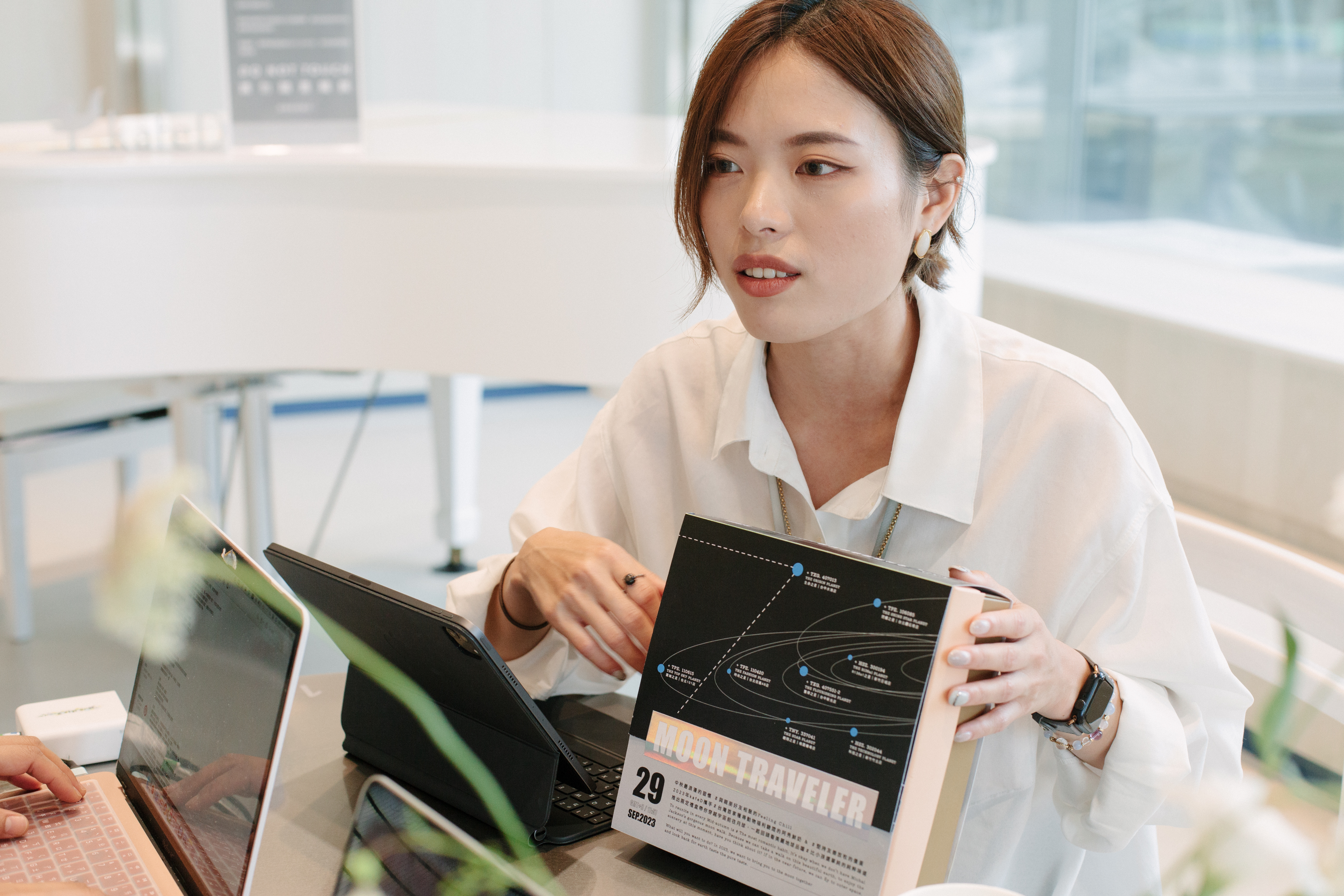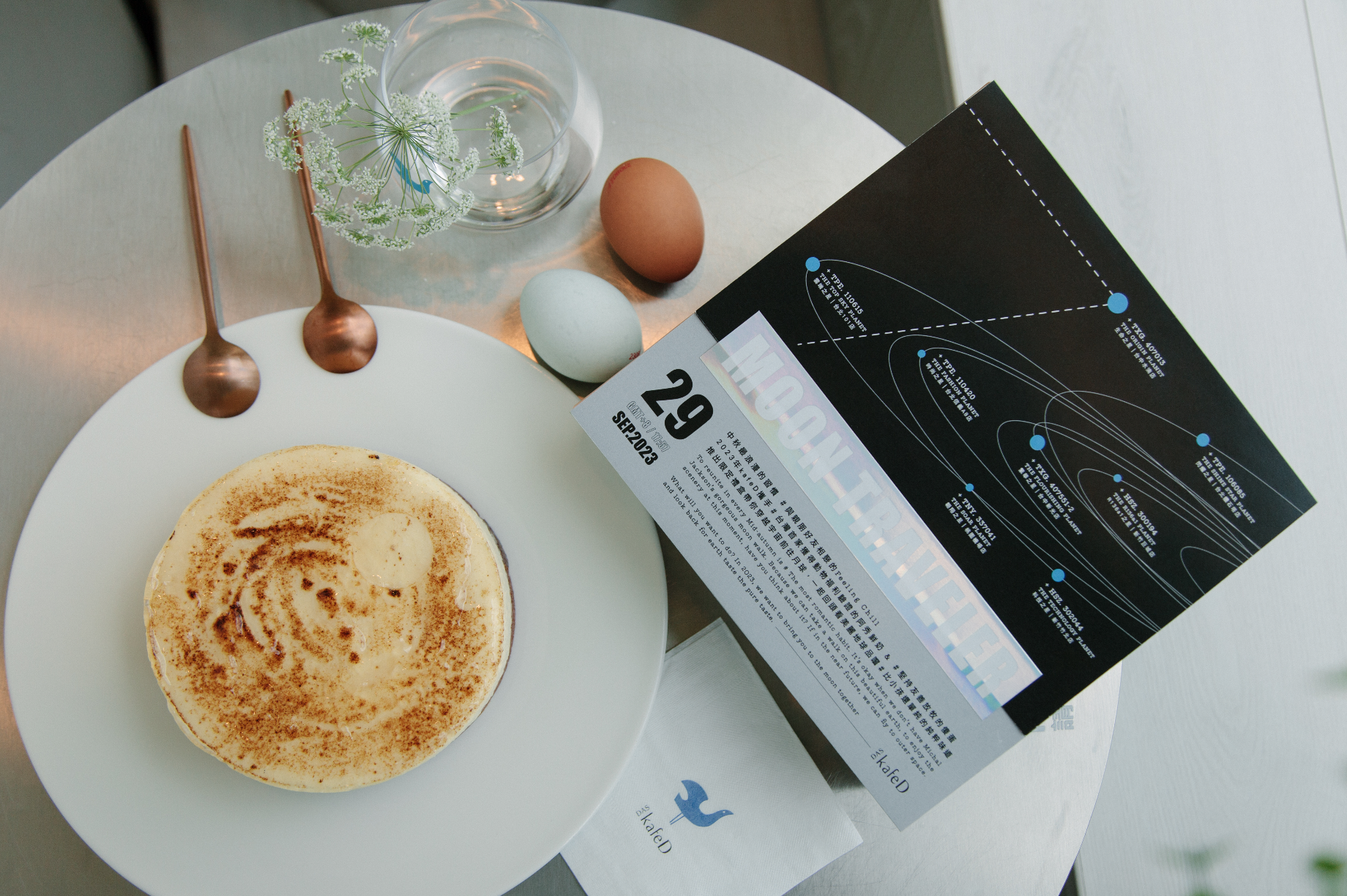延續月亮的意象概念,設計師 Elise 將一輪又一輪的年輪,以線條化變成一顆顆行星的軌跡,以具象方式領航每個人成為月球旅者。一條條的路徑也像是席布斯特蛋糕(Chiboust)製作的足跡,食材來源有跡可循,不僅能夠看見食物的溯源,也能看到 kafeD 實踐友善環境的行動力,帶著大家從月球回歸地球,進而探索純粹的美味。