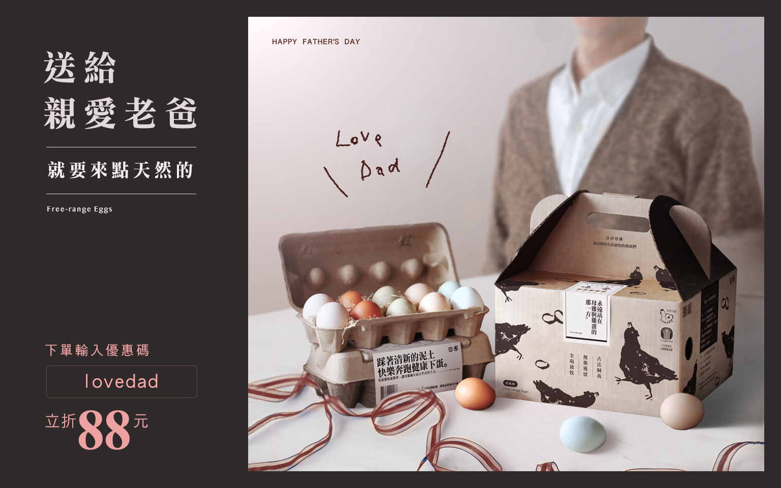 快閃特惠!傻蛋獻上$88折扣優惠!即日起至8/15止,下單輸入「lovedad」即可立享優惠,用最天然養生的放牧蛋,補充爸爸的不老元氣!
