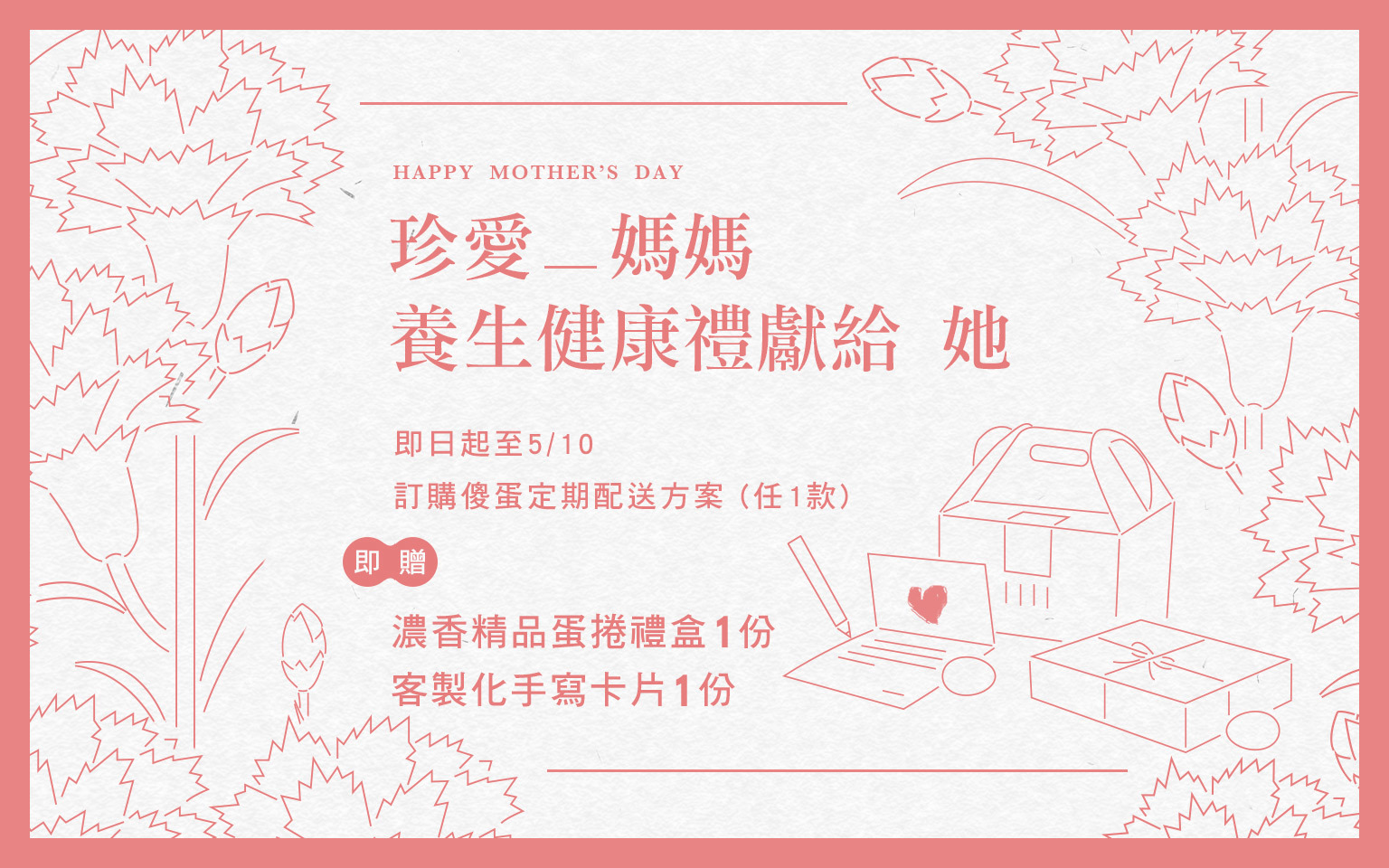 即日起選擇定期配送【再贈 濃香精品蛋捲】(市價 $330),以及傻蛋設計師為您手寫的母親節卡片1張~有最新鮮的放牧蛋,以及可愛禮盒和卡片,將愛意溫暖表達出來(๑•̀ㅂ•́)و✧